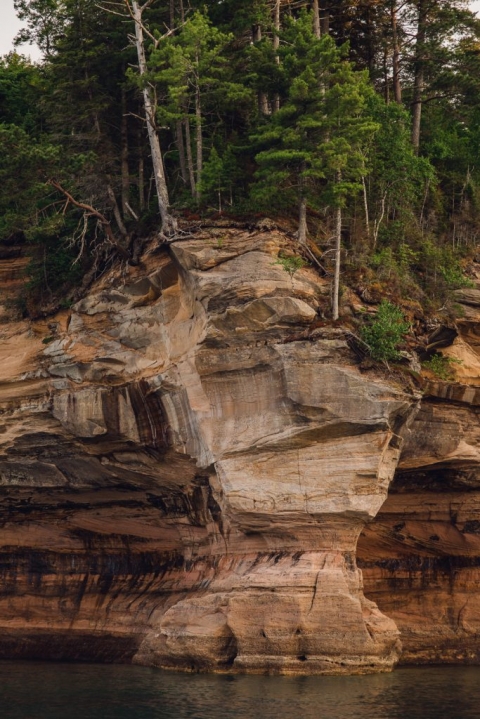 The rocks along the coast line created fascinating formations and it was hard to believe the colors were naturally occurring. The name “Pictured Rocks” comes from the streaks of mineral stain that decorate the cliffs. Stunning colors occur when groundwater oozes out of cracks and trickles down the rock face. Iron (red and orange), copper (blue and green), manganese (brown and black), and limonite (white) are among the most common color-producing minerals.